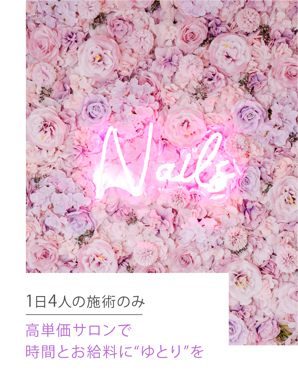 オプションを追加いただくお客様も多く、平均顧客単価は9,000〜10,000円。 1日4人の施術で”ゆとり”をもって働けるため、疲弊せずにネイリストを続けられます。